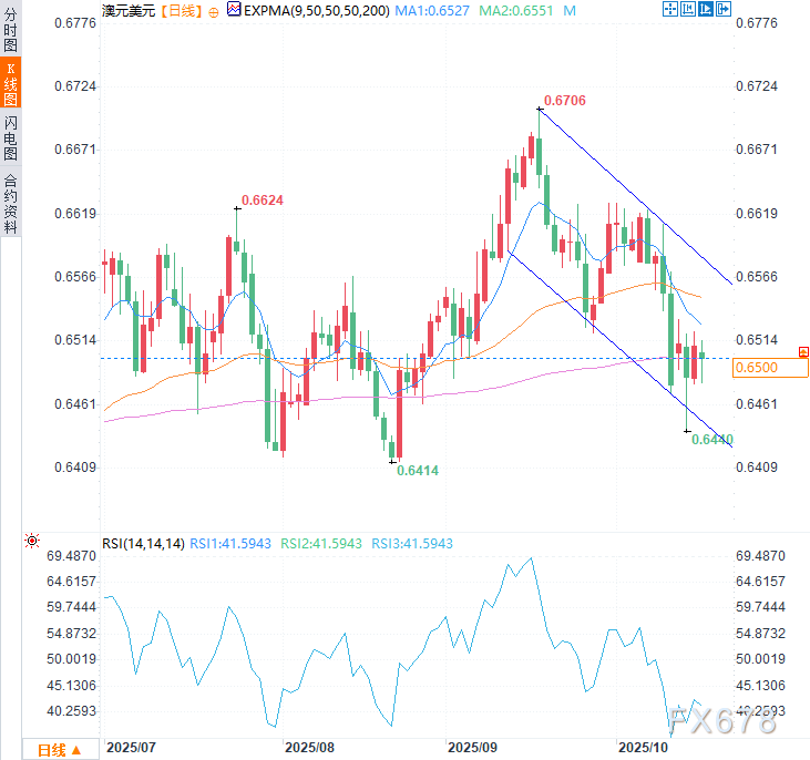 周四(10月16日)亚市时段,澳元兑美元走低,低于预期的澳大利亚就业数据公布后,澳元一度下跌近0.5%,至0.6479,而后小幅回升,但总体仍属于看跌趋势内。