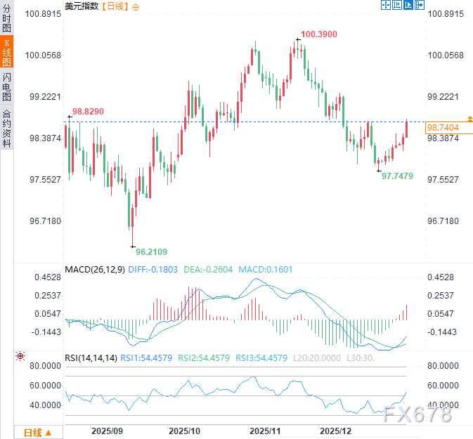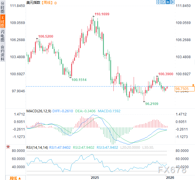 美元在2026年初开局谨慎,第一季度将检验货币政策分歧、劳动力市场信号及风险情绪的影响。周一(1月5日)亚欧时段,美元指数小幅走高,涨幅约0.3%,交投于98.70附近。因委内瑞拉总统被捕,强化了美元作为避险资产的资金流入。从日线和周线时间框架看,除非美元指数能收复100关口附近的关键阻力位,否则下行修正结构依然显著。