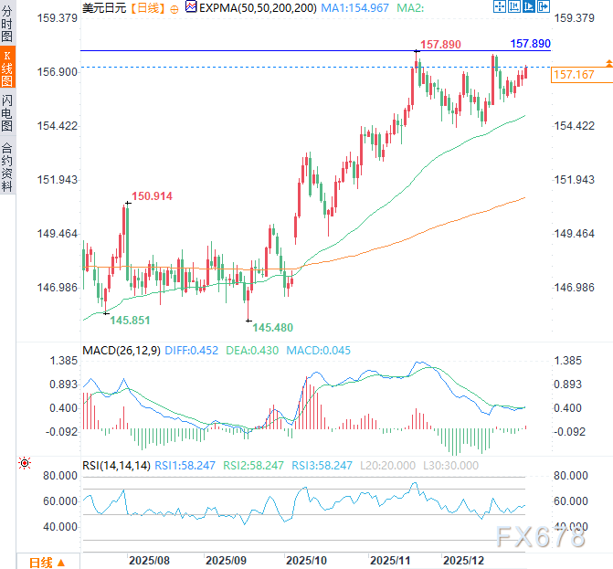 上行方面,11月20触及的近十个月高点157.89仍构成强劲阻力。