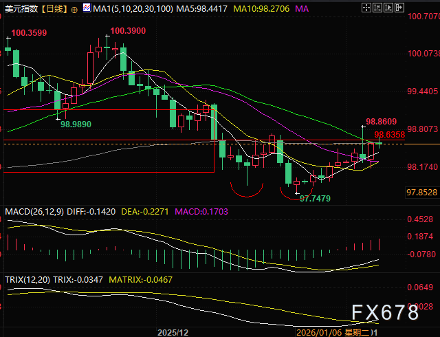 美元指数接近箱体50%分位的短期多空分水岭,如果能站稳98.63附近则美元有望继续反弹。