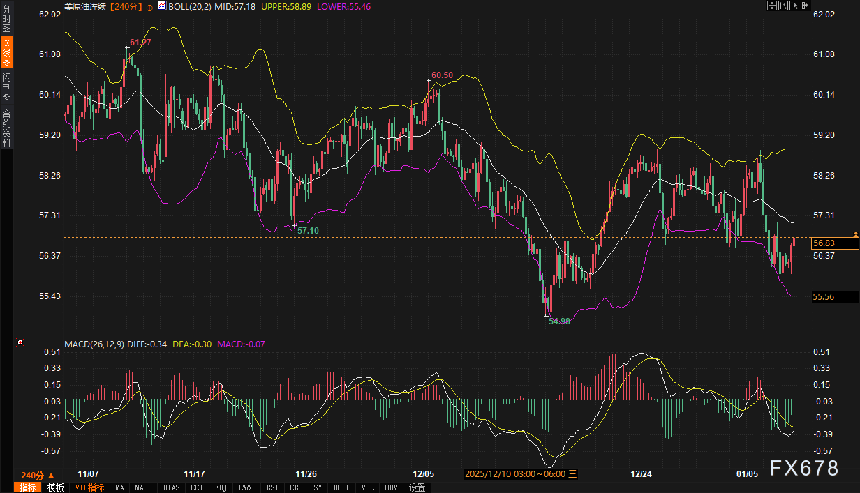 原油市场方面,特朗普宣称委内瑞拉将向美国输送高达5000万桶石油,且美国将控制相关收益。WTI原油4小时图显示价格已突破布林带中轨57.18美元并向上轨58.89美元方向运行,MACD指标虽仍处负值区域但DIFF线-0.34有上穿DEA线-0.30形成金叉的迹象。盘中需密切关注价格能否站稳57美元整数关口,该位置同时是前期震荡区间上沿与布林带中轨交汇处。若委内瑞拉产量在美资公司介入下加速恢复,可能对全球原油供应格局产生中长期影响,但短期内基础设施重建的复杂性限制了市场涨幅。