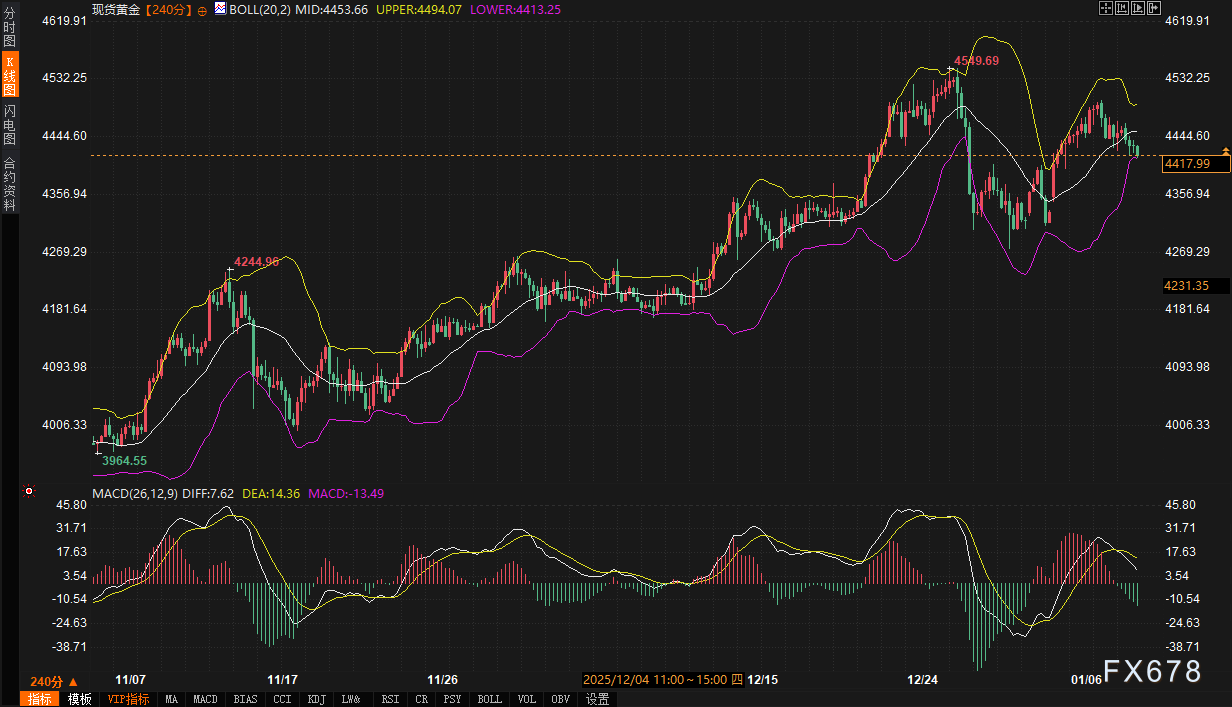 这种政策逻辑对市场预期管理产生了双重影响。一方面,其不可预测性增加了地缘政治风险溢价,支撑了黄金的长期避险需求。现货黄金4小时图显示价格已跌破布林带中轨4441.07美元并向下轨4349.82美元方向运行,MACD指标中DIFF线15.50低于DEA线18.52,短期动能偏弱。关键支撑区间位于4330-4350美元区域,该区间不仅是布林带下轨所在,也是去年12月震荡平台的上沿。另一方面,美元因其发行国的这种单边行动倾向,正逐渐被部分国际投资者视为“风险来源”而非“避险标的”,这种认知转变可能在中期内削弱美元的结构性需求。