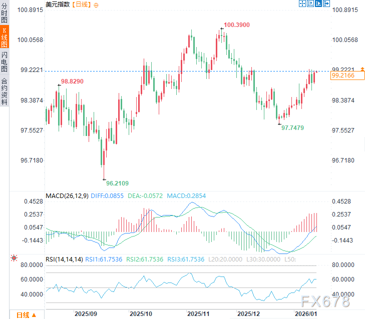 当前局势本质是“政治风险溢价”注入美元定价。若风波演变为宪政危机,美元避险属性可能暂时让位于对美国制度稳定性的担忧。周三亚市时段,美元指数于99.20附近窄幅震荡。