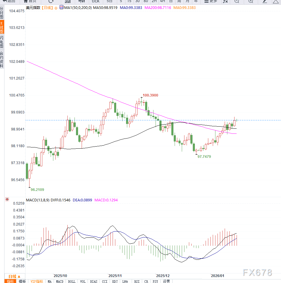从日线结构来看,美元指数在此前连续反弹后稳守98.80上方,并逐步上探至99.30一线,整体仍处于多头占优的运行通道。