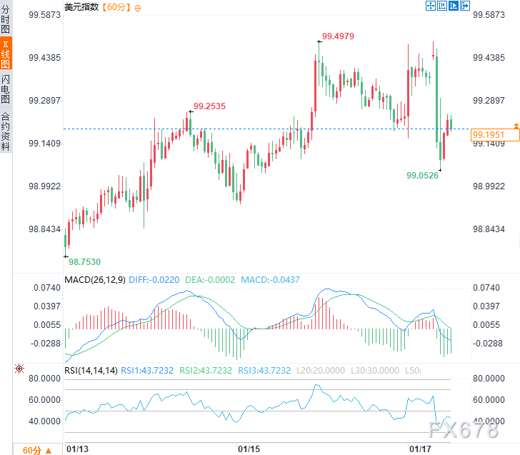 周一亚市时段,美元指数一度冲高至七周高点99.49,而后震荡回落,日内跌幅约0.19%,现交投于99.20附近。
