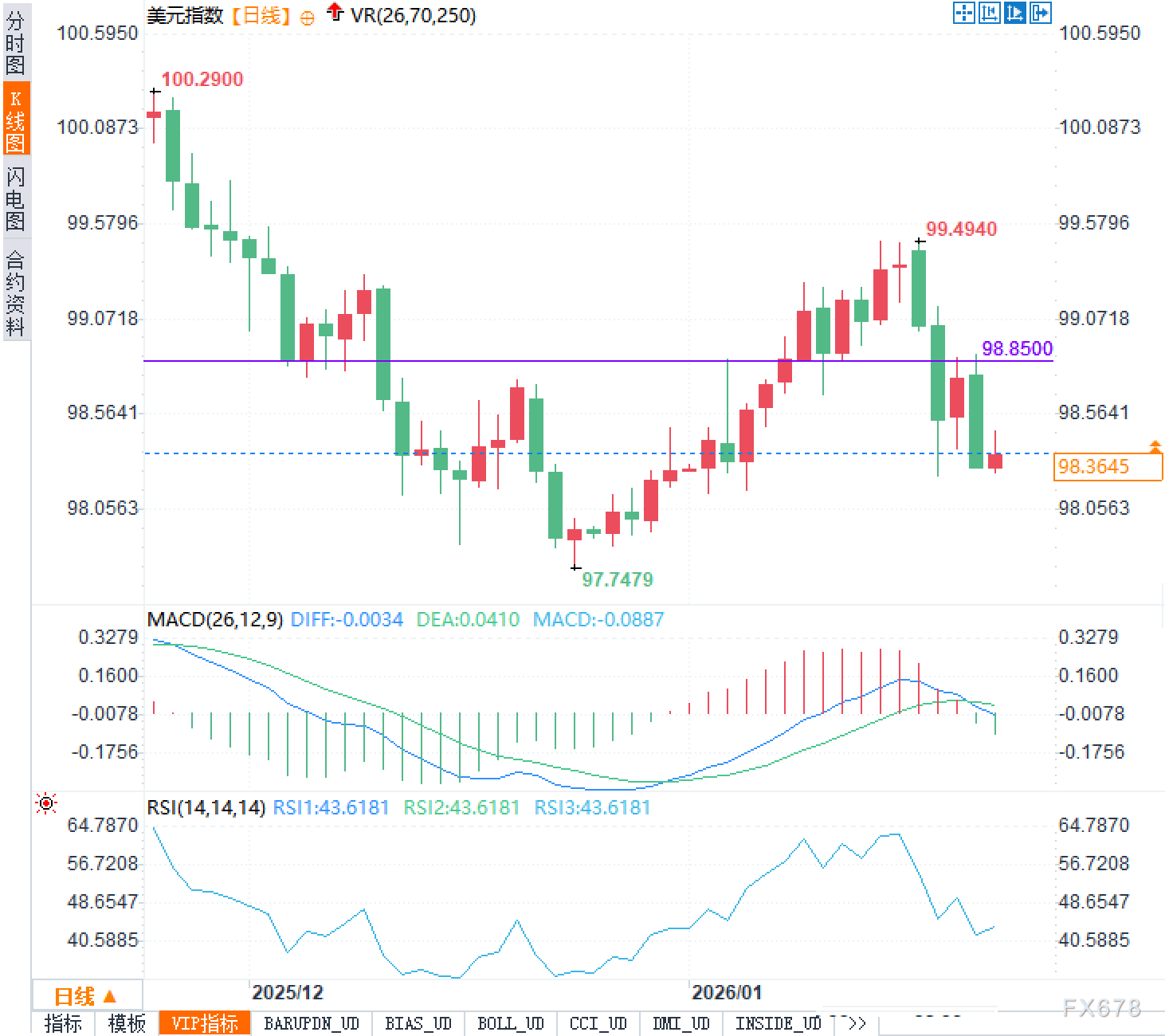 RSI(14)读数为43.6181,处于中性偏弱区间,既未进入超卖状态,也未显示出多头强势介入的迹象。这意味着当前抛压虽未极端化,但买盘同样缺乏持续进攻意愿。结合消息面来看,技术形态与市场情绪高度一致:短线利好可以带来波动,但不足以改变整体偏弱格局。98.23作为近期低点,具备一定技术支撑意义,容易引发短线博弈;而98.8500则是关键分水岭,唯有放量突破才可能打开上行空间。