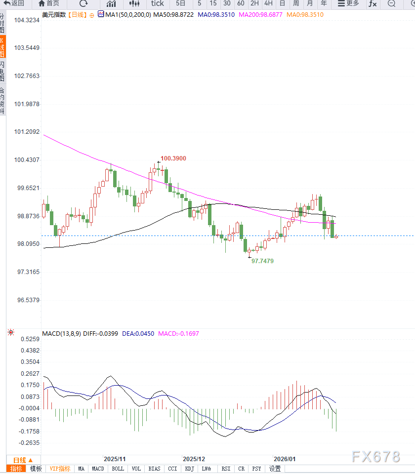 从技术结构看,美元指数在98.30附近维持支撑,短线整理明显。日线级别显示,指数已从近期高点回落,但未跌破关键均线支撑区间,表明短期下行动能有限。